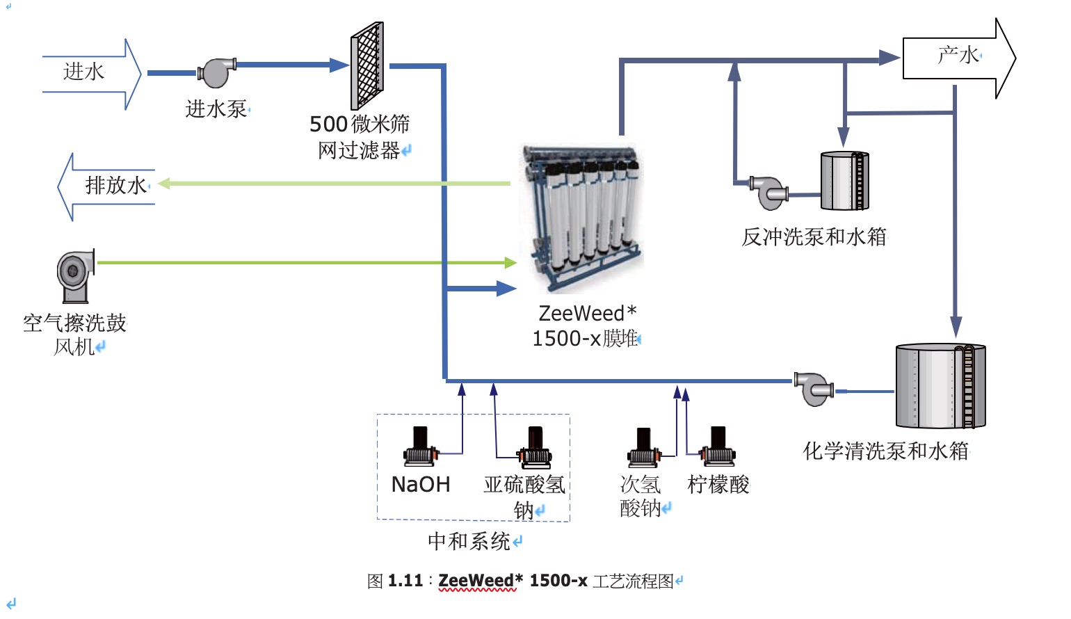 以下章節(jié)簡要描述了組成 ZeeWeed* 1500-x 超濾膜系統(tǒng)的主要子系統(tǒng)和組件。請參考圖 1.11:ZeeWeed* 1500-x 工藝流程圖
