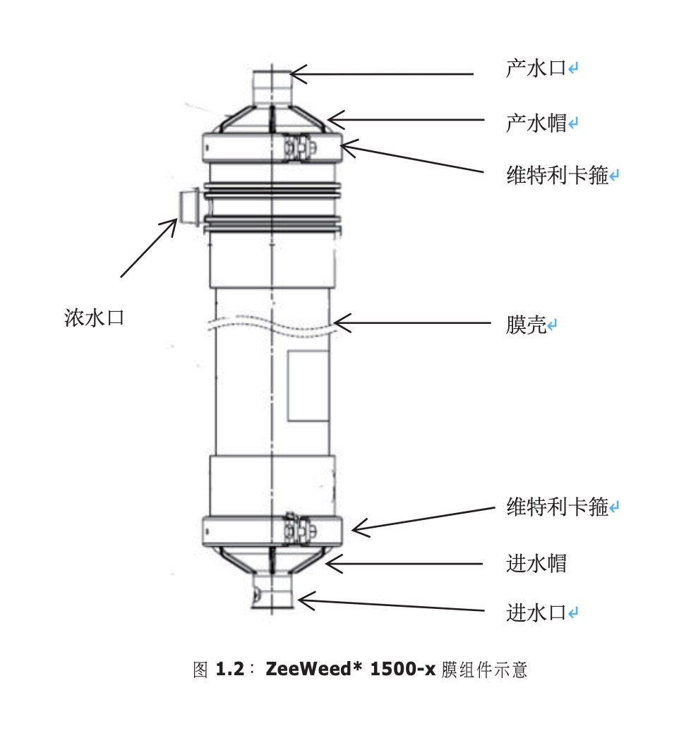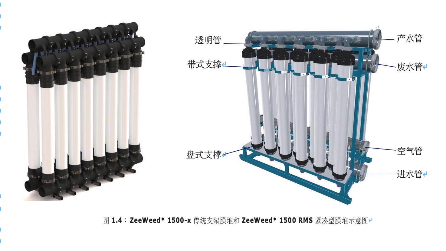一個 ZeeWeed* 超濾膜系統(tǒng)(圖 1.4)是一個生產(chǎn)單元,包含一個或多個膜堆,并連接到產(chǎn)水子系統(tǒng)。一個或多個 ZeeWeed* 膜列構(gòu)成了一個 ZW 水處理裝置,包括共用進水、濃水、空氣擦洗、反洗、清洗和壓縮空氣子系統(tǒng)。